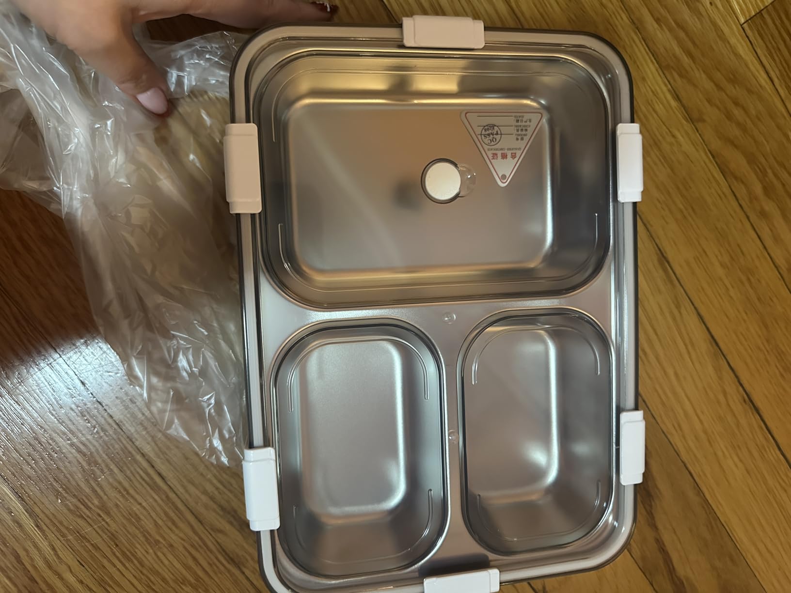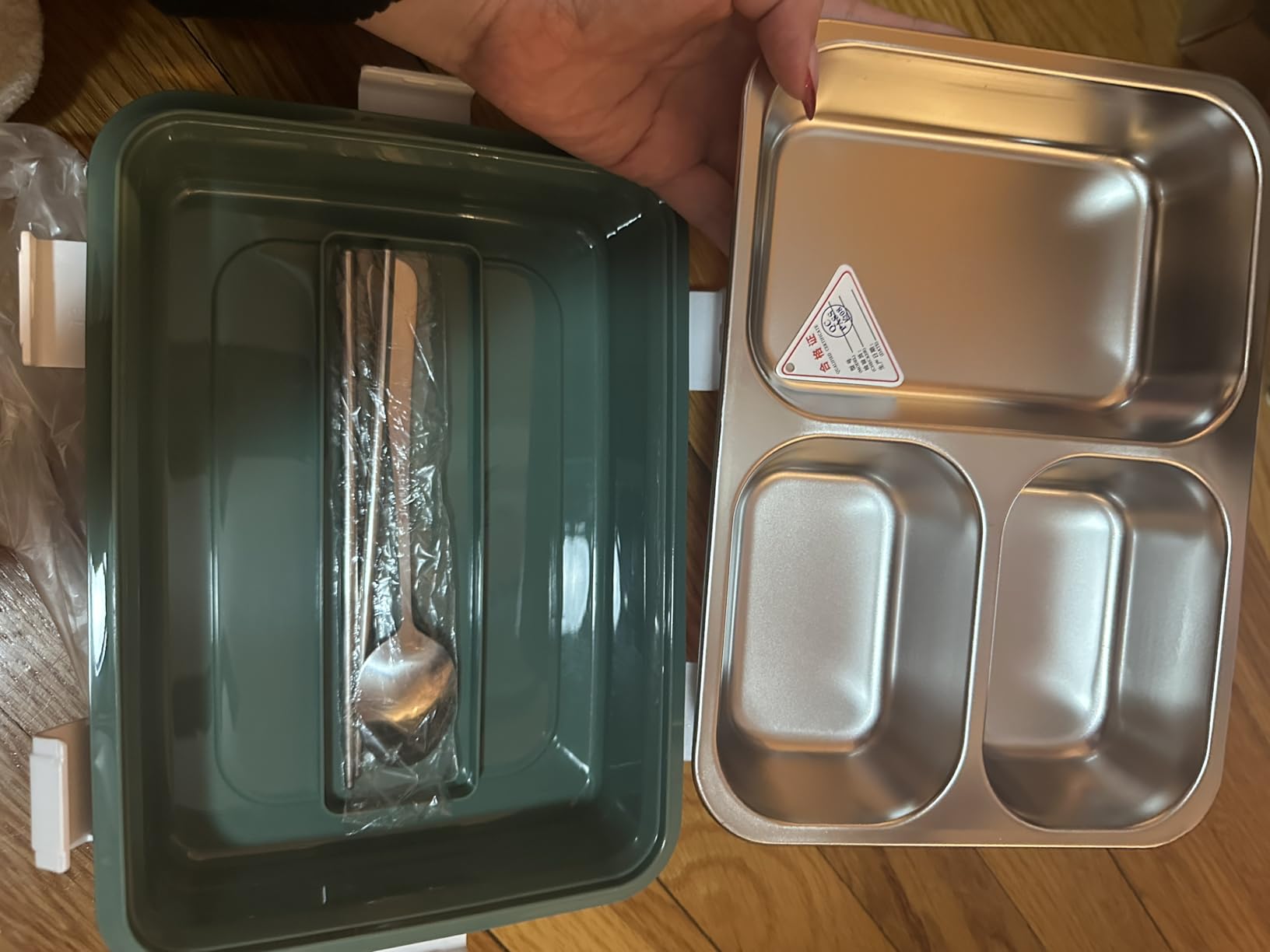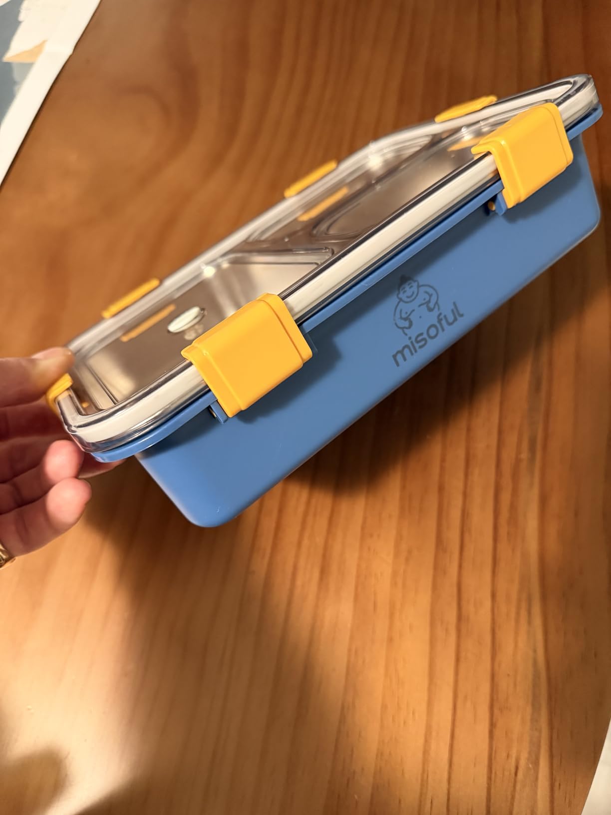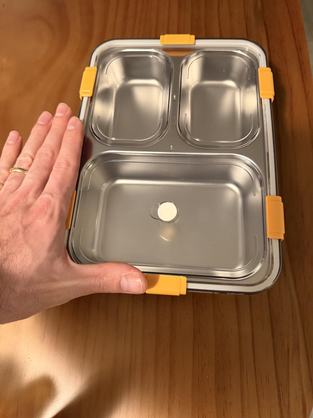 This bento container looks amazing and it’s built with good materials, the aluminum feels sturdy and good quality and the base is built from plastic. I’m showing a photo with my hand next to it for perspective but the container is pretty large and you’ll have enough space for plenty of food.